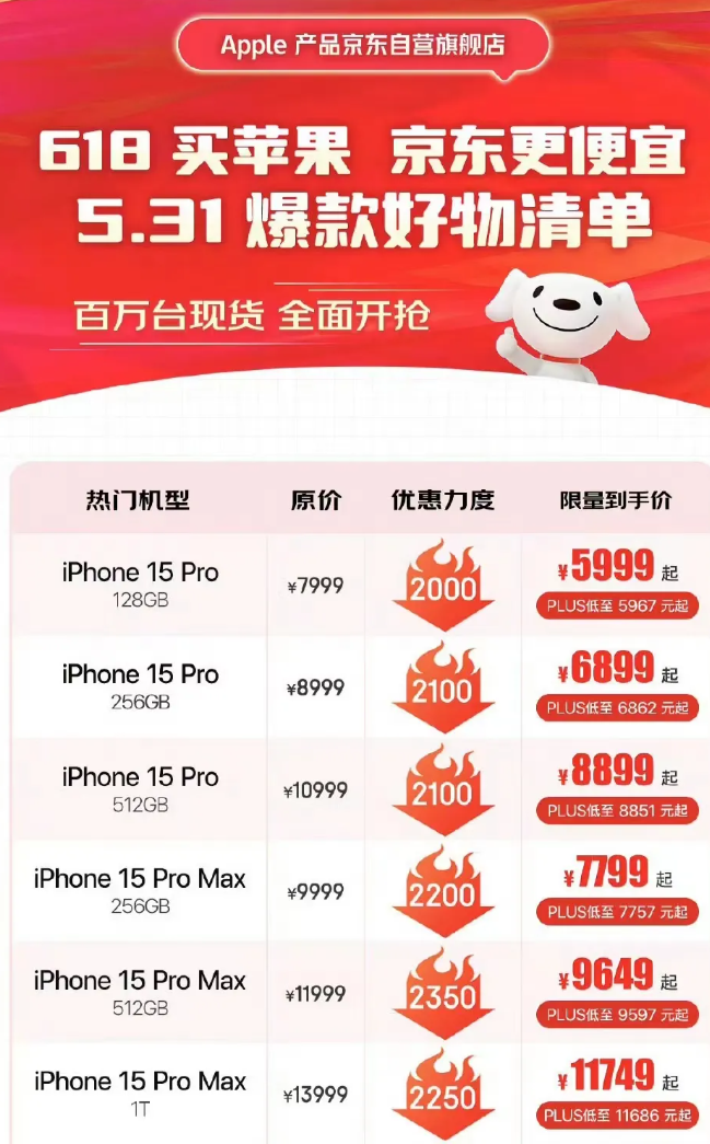 其中Apple产品京东自营旗舰店的iPhone 15 Pro Max享受到了最高达2350元的巨额优惠,而iPhone 15 Pro的售价也直接降低了至少2000元。